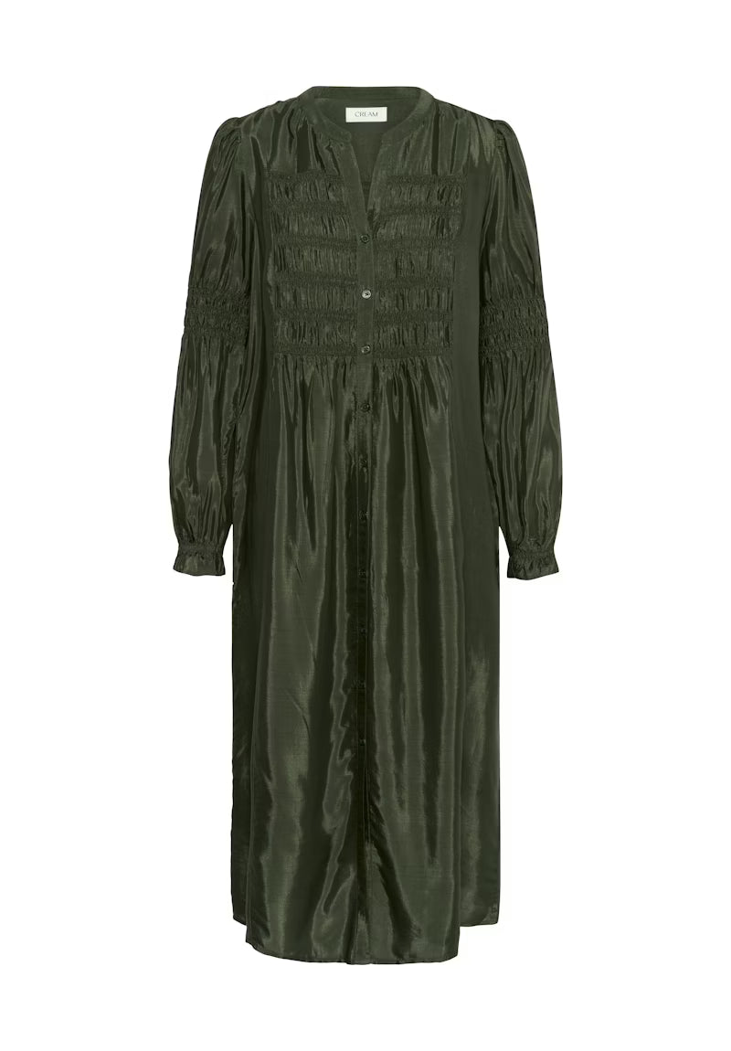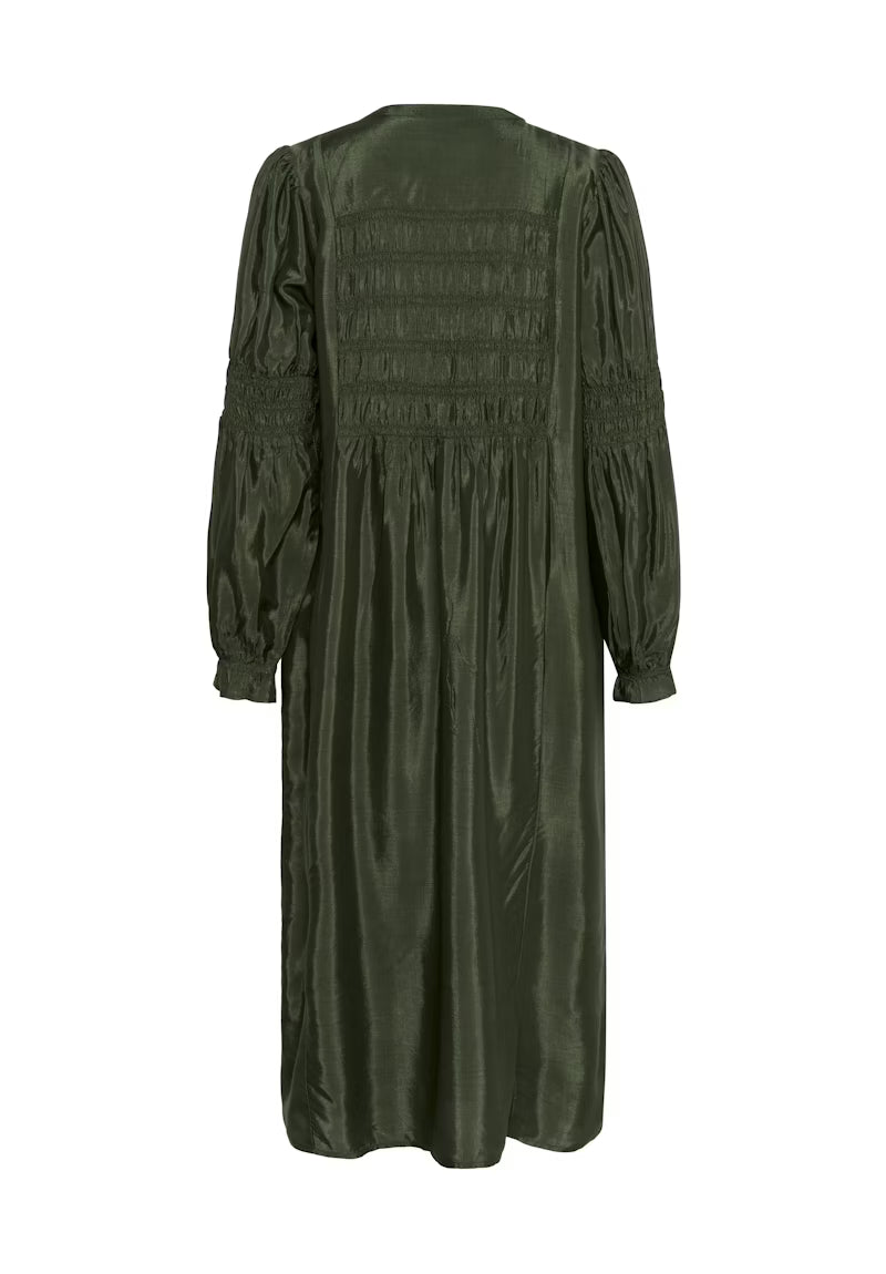 Midiklänning med avslappnad passform och rynkade detaljer över livet och ärmarna. V-ringning fram och knäppning ger stil och användbarhet för många tillfällen.
