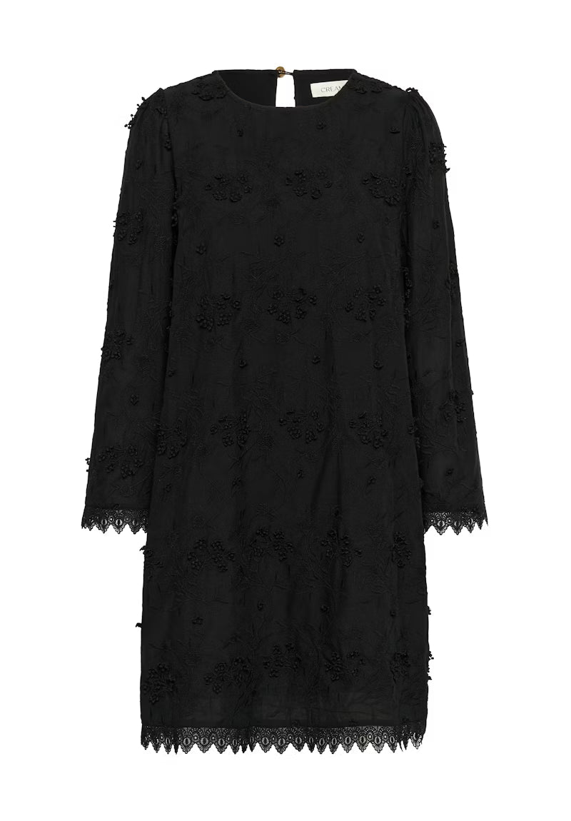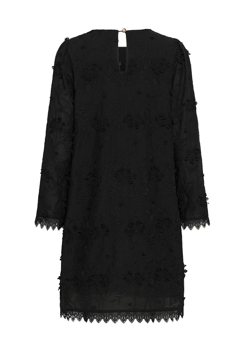 Den här damklänningen har ledig passform, rund halsringning och långa ärmar. Broderi och spetskant ger klänningen elegans och komfort.