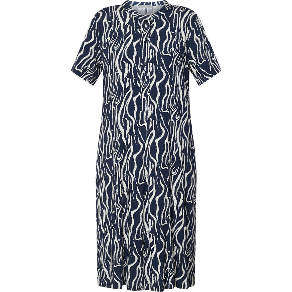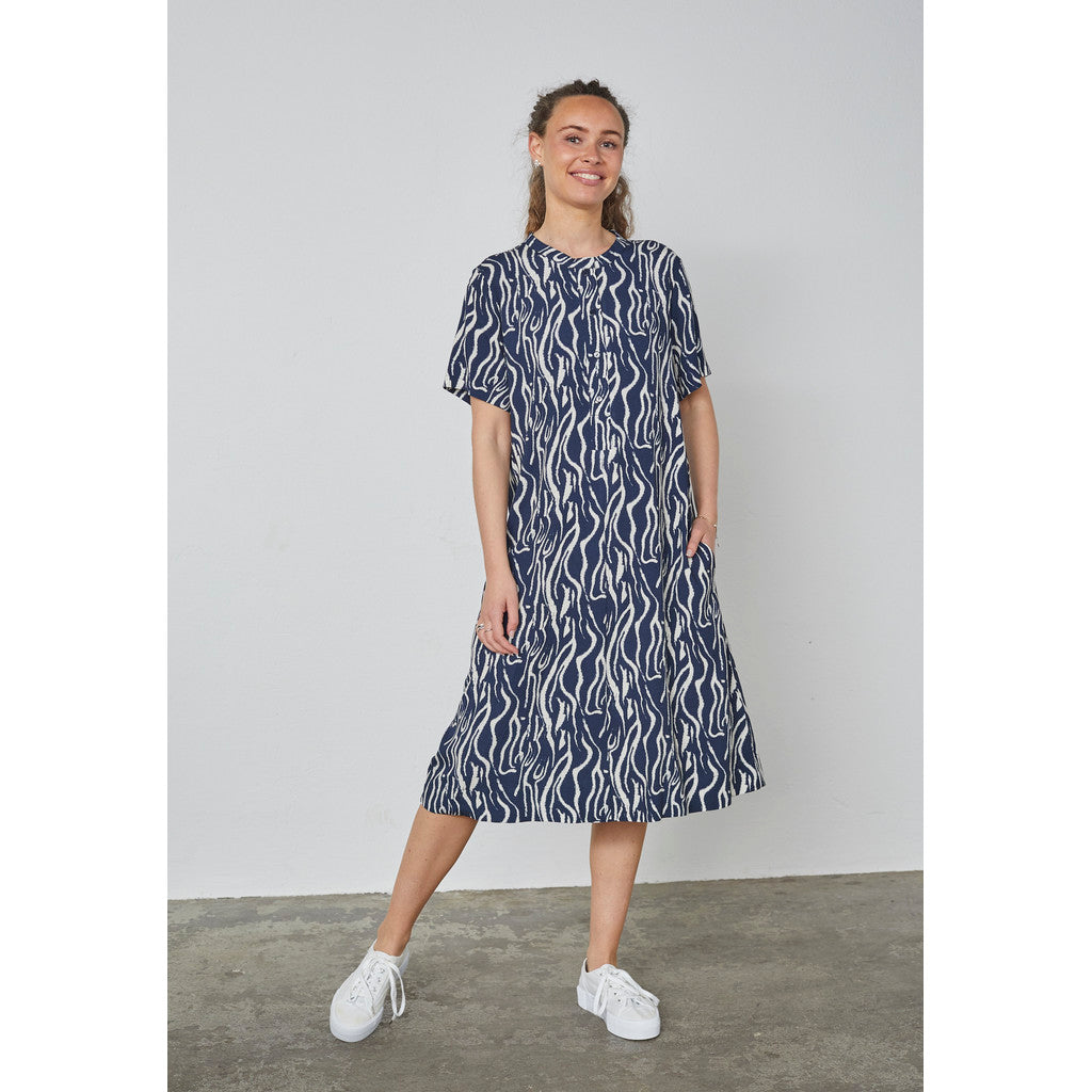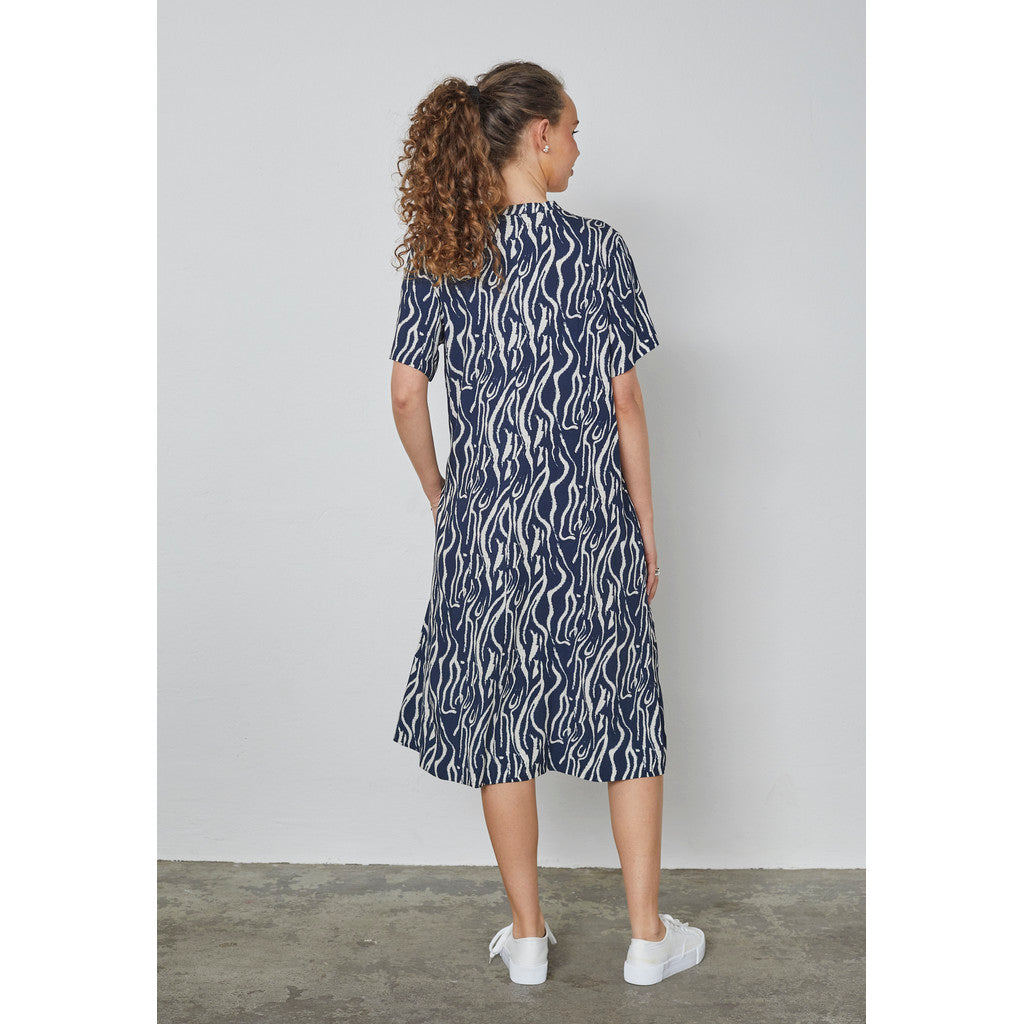 Denna klänning från Elton har ett förfinat mönster kombinerat med en elegant A-linjeformad silhuett som faller vackert runt kroppen. Det detaljerade mönstret tillför djup och en exklusiv känsla, medan den mjuka viskoskvaliteten med en antydan till stretch säkerställer komfort och graciös rörelse. En feminin och välbalanserad stil med ett tidlöst uttryck.