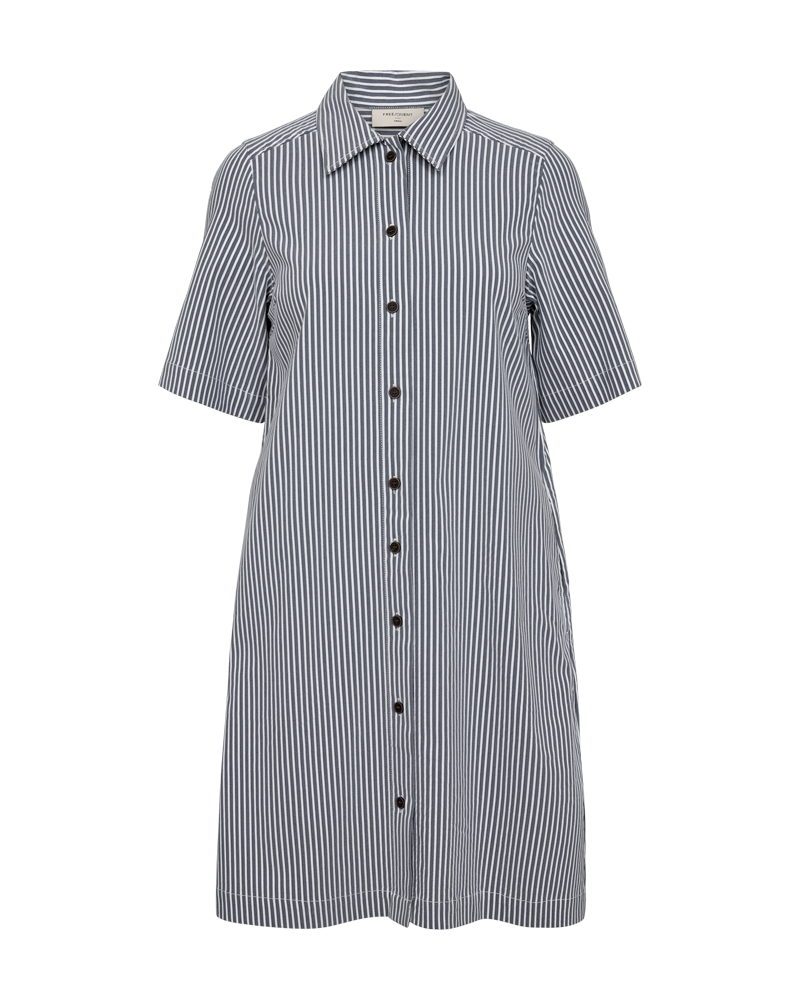 Den här vackra skjortklänningen från Freequent kombinerar komfort och stil på ett sömlöst sätt. Med ett klassiskt snitt och en modern twist är den här klänningen perfekt för både vardag och fest.