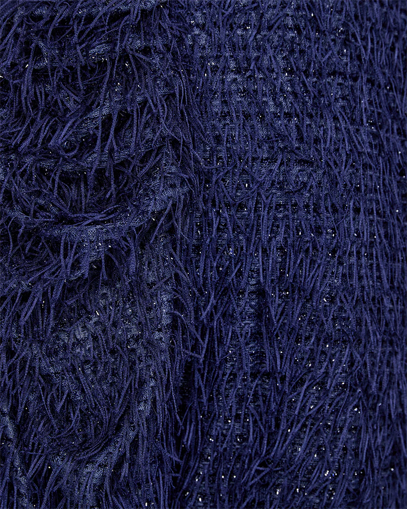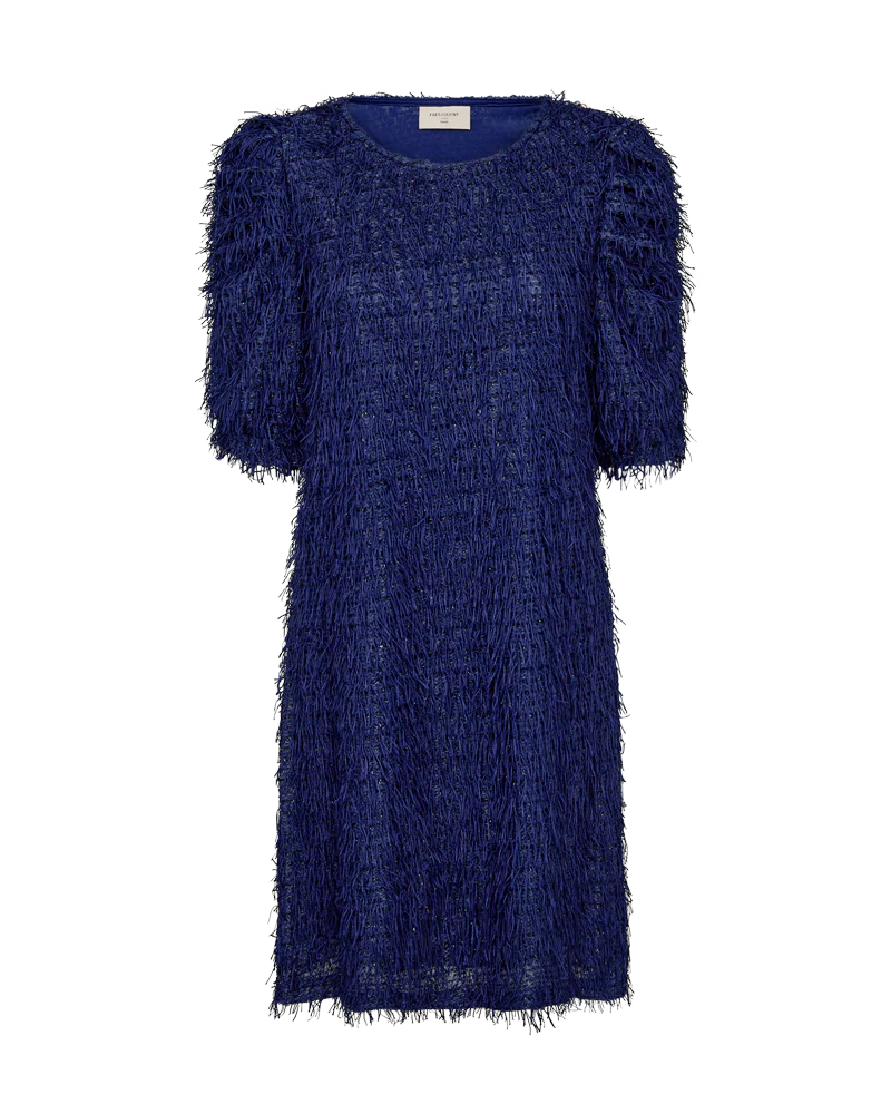 Klänning från Freequent i ett mjukt material med fina fransar och en vacker glittereffekt i färgen "Patriot Blue". Klänningen har en enkel silhuett med mjuk jerseyfoder, halva ärmar, rundad urringning och en vanlig passform.