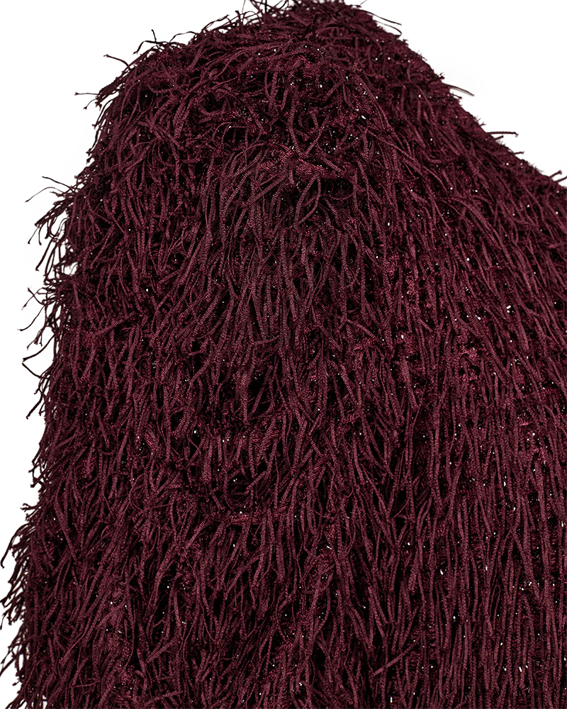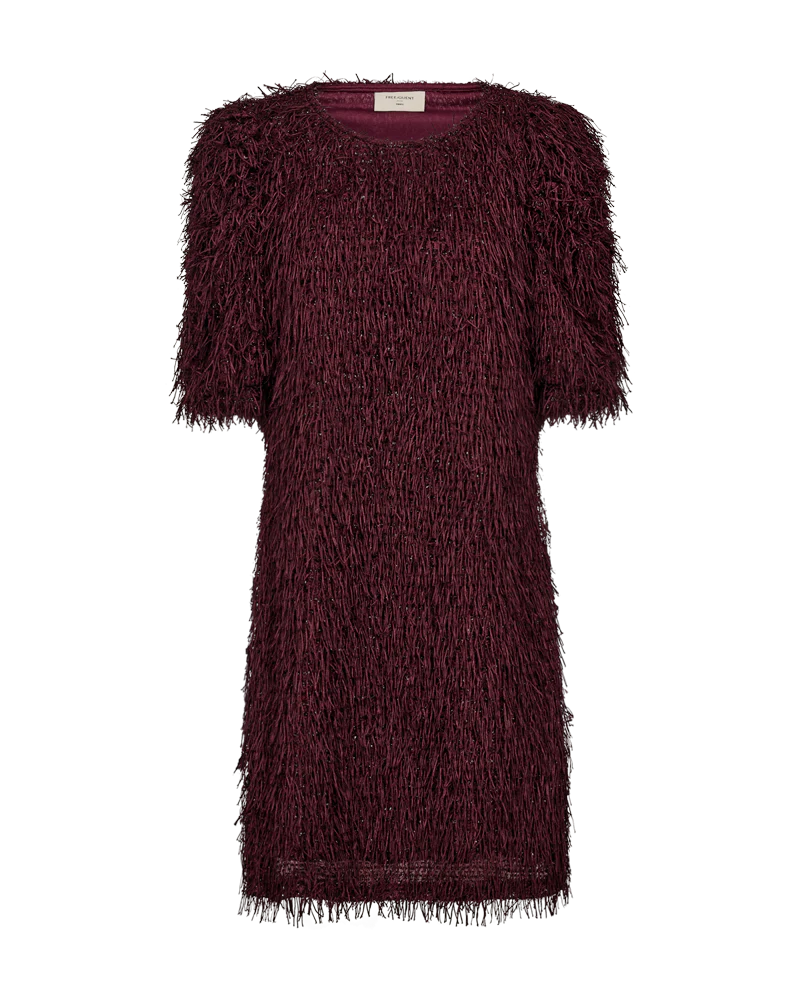 Klänning från Freequent i ett mjukt material med fina fransar och en vacker glittereffekt i färgen "Port Royale". Klänningen har en enkel silhuett med mjuk jerseyfoder, halva ärmar, rundad urringning och en vanlig passform.