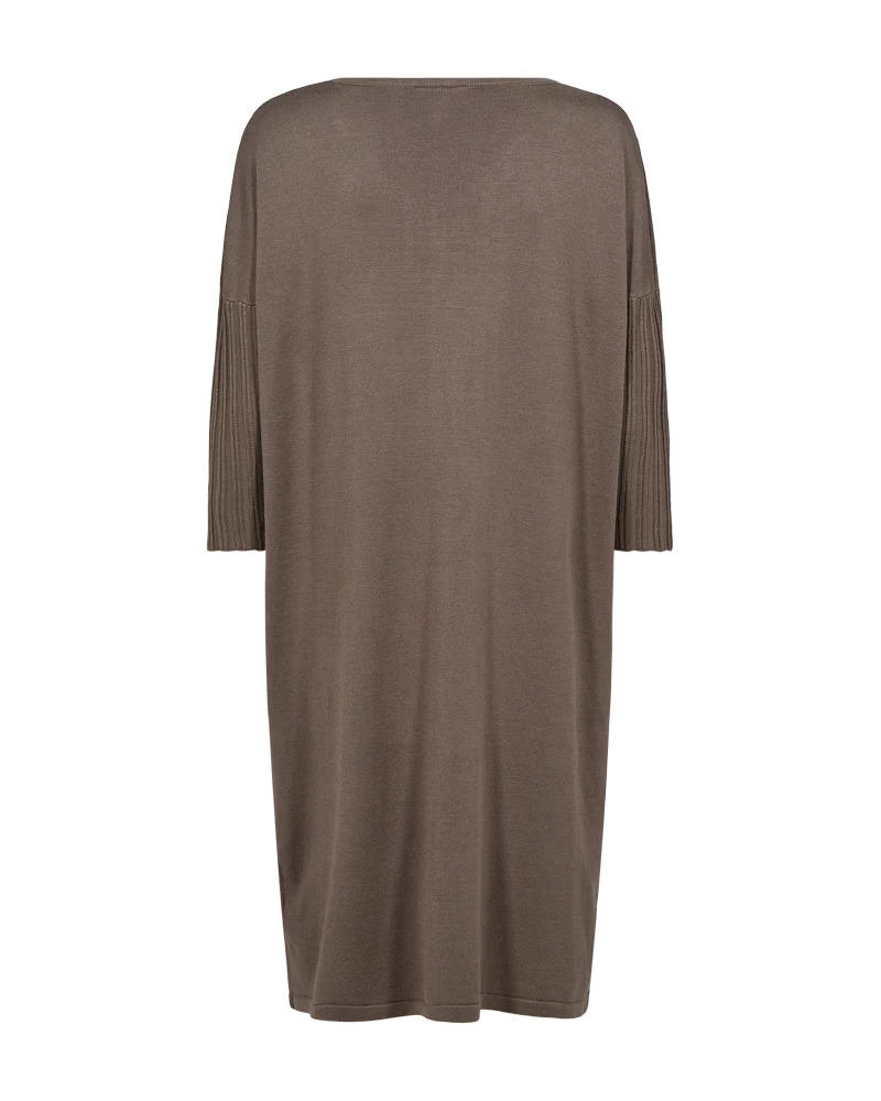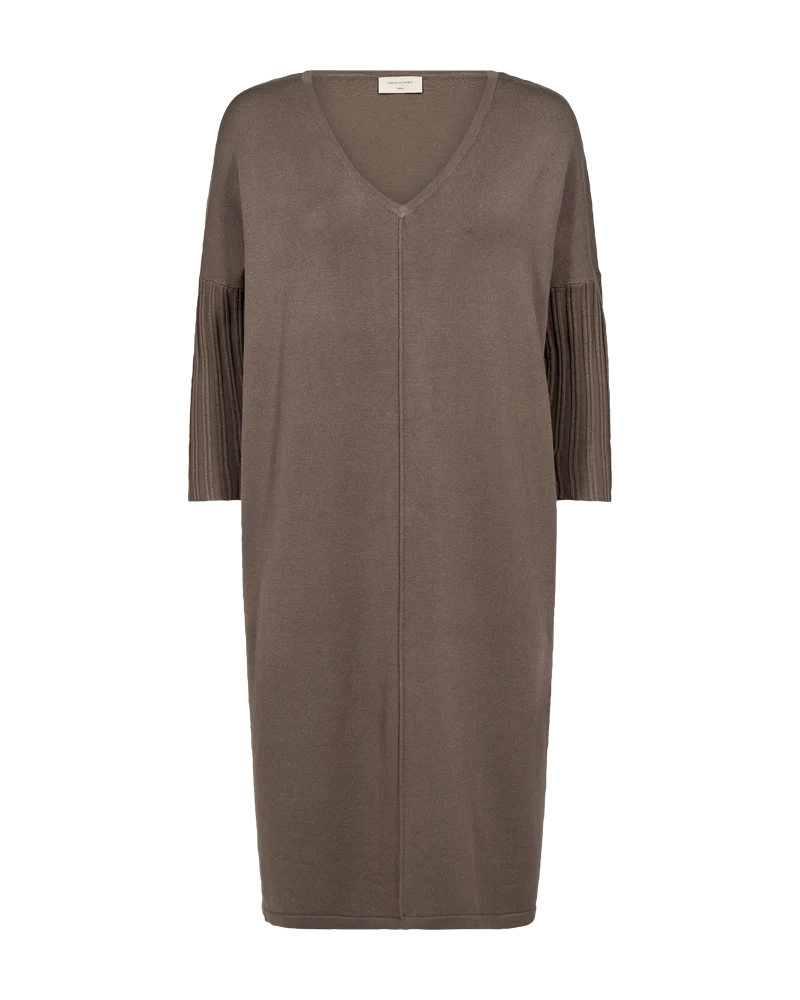 Klänning från Freequent i ett mjukt, fint stickat material. Klänningen har en enkel silhuett med V-ringning, trekvartsärmar med resår, lös passform och broderi framtill.