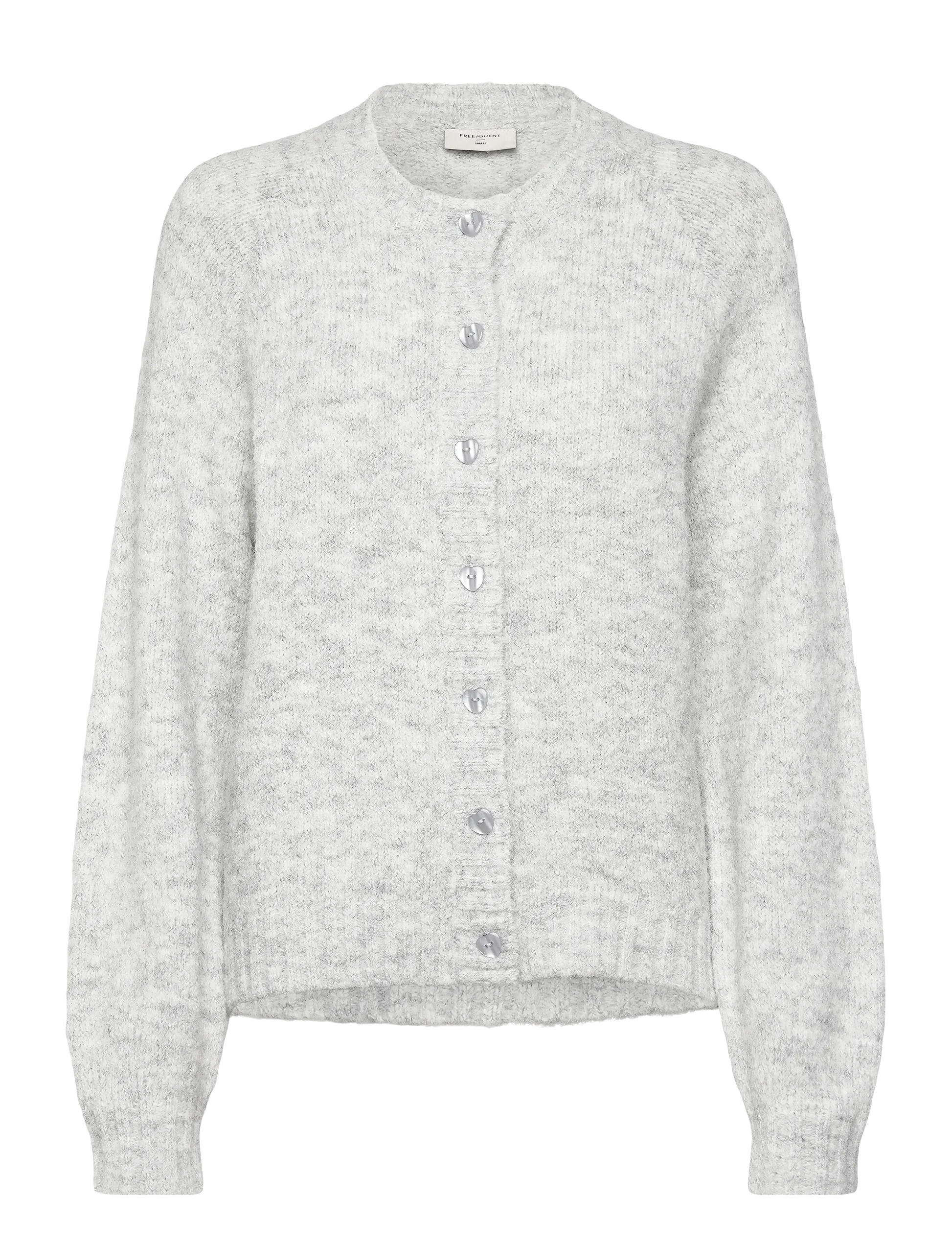 Kofta från Freequent i ett mjukt, stickat material. Koftan har en enkel silhuett med långa ballongärmar, resår, löst sittande passform och hjärtformade knappar framtill.